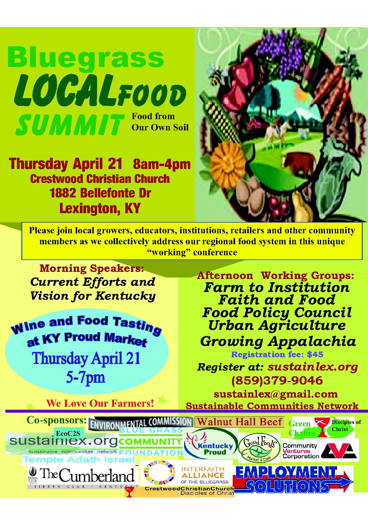 Bluegrass Local Food Summit Co-sponsors: Employment Solutions/CTE, Interfaith Alliance of the Bluegrass, Bluegrass Community Foundation, Good Foods Market and Café’, Green Chalice/Disciples of Christ, Kentucky Proud Market, Walnut Hall Beef, LFUCG Environmental Commission, Crestwood Christian Church, Community Ventures Corporation, Temple Adath Israel, Erica Horn, Lisa Satin, Sierra Club-Cumberland Chapter, EcoC2 Services, Central Kentucky Council for Peace and Justice, Kentucky Department of Agriculture